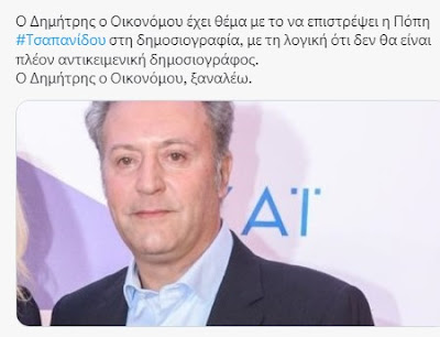 Ο Δημήτρης ο Οικονόμου έχει θέμα με το να επιστρέψει η Πόπη #Τσαπανίδου στη δημοσιογραφία, με τη λογική ότι δεν θα είναι πλέον αντικειμενική δημοσιογράφος. Ο Δημήτρης ο Οικονόμου, ξαναλέω.